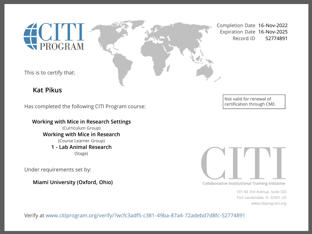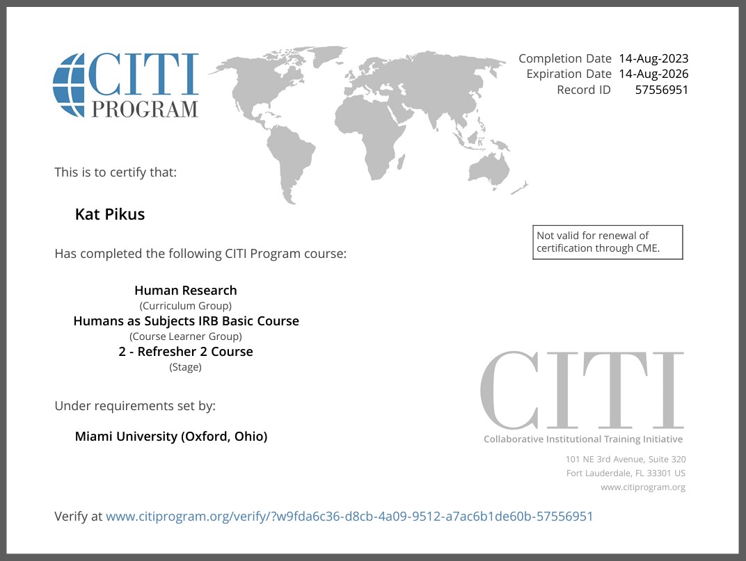 One of the significant parts of doing research is having the proper training. Everyone needs a refresher to solidify information. This is my certification for working with human subjects. I will have to renew this certification in the later months of 2026.